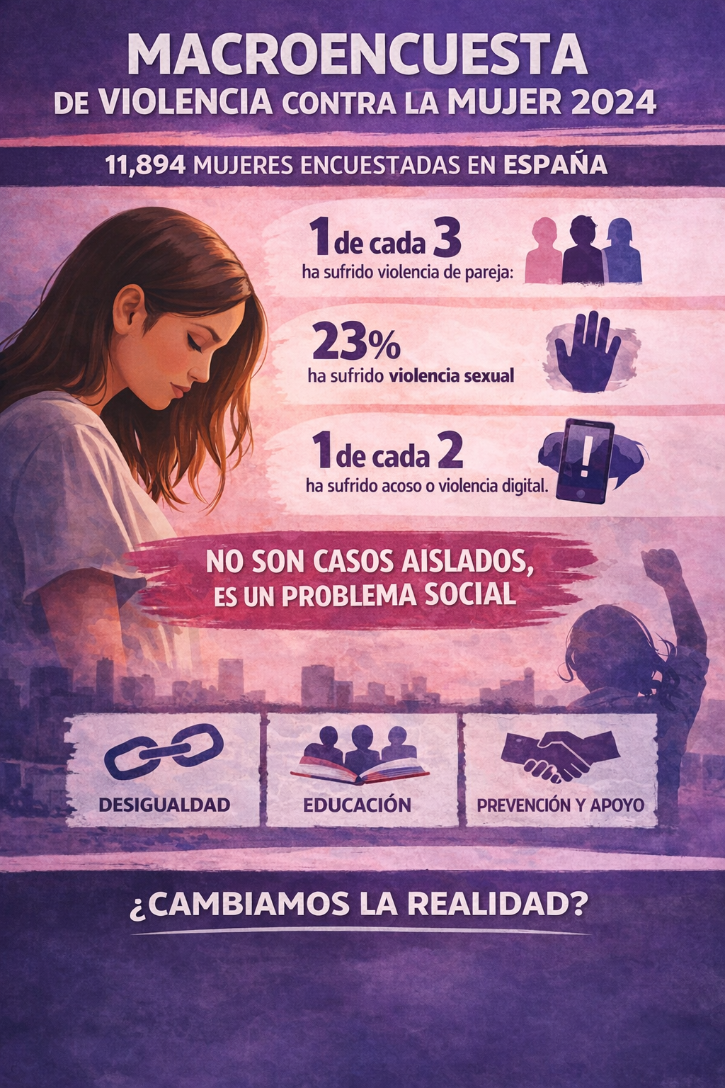 La Macroencuesta de Violencia contra la Mujer 2024 vuelve a poner cifras y testimonios a una realidad que sigue presente en nuestra sociedad: la desigualdad y las múltiples formas de violencia que sufren muchas mujeres en España.